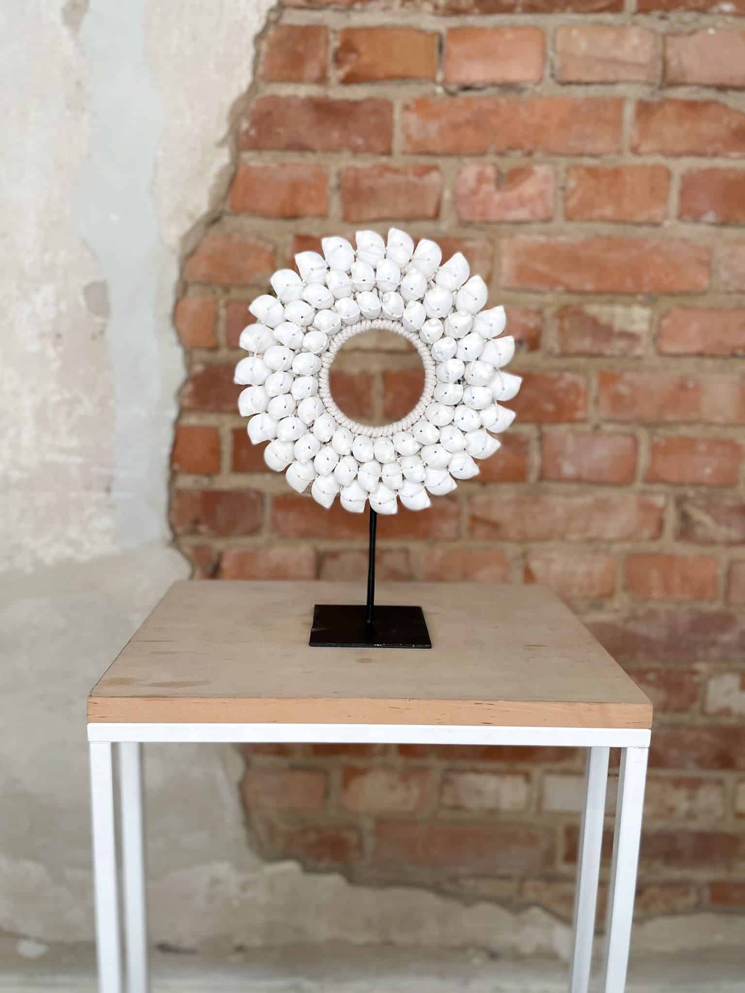 Ozdoba z muszelek to kolejna propozycja, do stworzenia której zainspirował nas morski klimat Bali. Jest to subtelny dodatek wykonany ręcznie przez balijskiego rzemieślnika. Każda z muszli jest ręcznie przyszywana do bawełnianej konstrukcji, tworząc spektakularną całość. Wykonana z pięknych, białych muszelek, które można znaleźć w morzu balijskim. Ta dekoracja stojąca z muszelek będzie dobrym dodatkiem do salonu lub sypialni. W zestawie otrzymasz również metalowy stojak.
