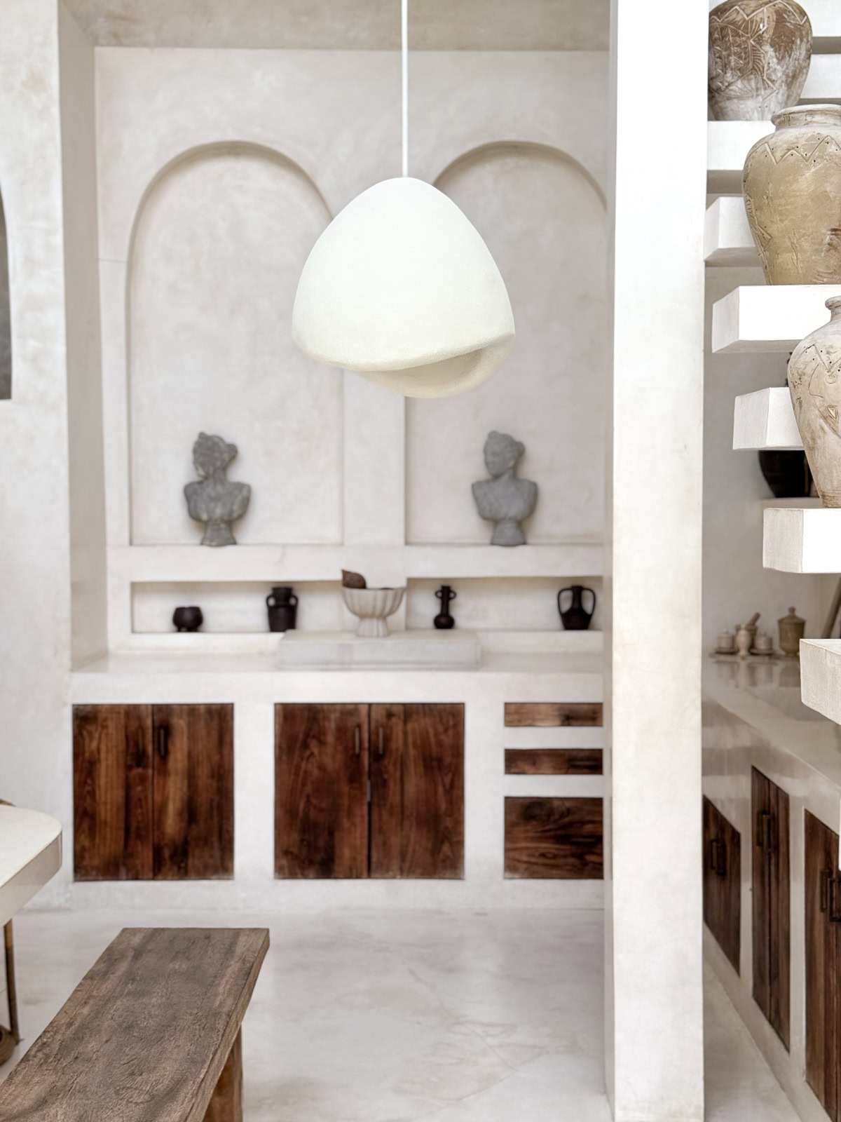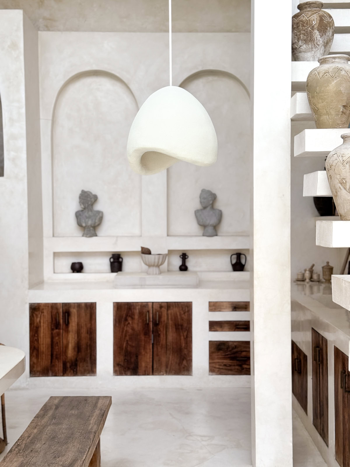 Lampa JAPANDI CREAM to model o smuklejszym, bardziej pionowym kształcie, który świetnie sprawdza się tam, gdzie liczy się nie tylko światło, ale też proporcja i rytm całej aranżacji. Jej forma została stworzona z myślą o przestrzeniach takich jak kuchnia, wyspa czy blat, gdzie lampa ma wyglądać lekko, ale jednocześnie wyraźnie zaznaczać swoją obecność. Powierzchnia wykańczana jest prawdziwym piaskiem, ręcznie nakładanym na zewnętrzną warstwę, dzięki czemu każda sztuka ma własną fakturę i naturalny, spokojny charakter.