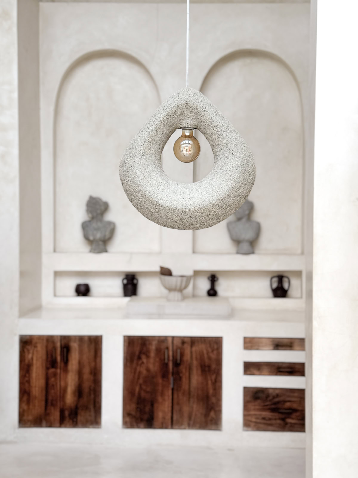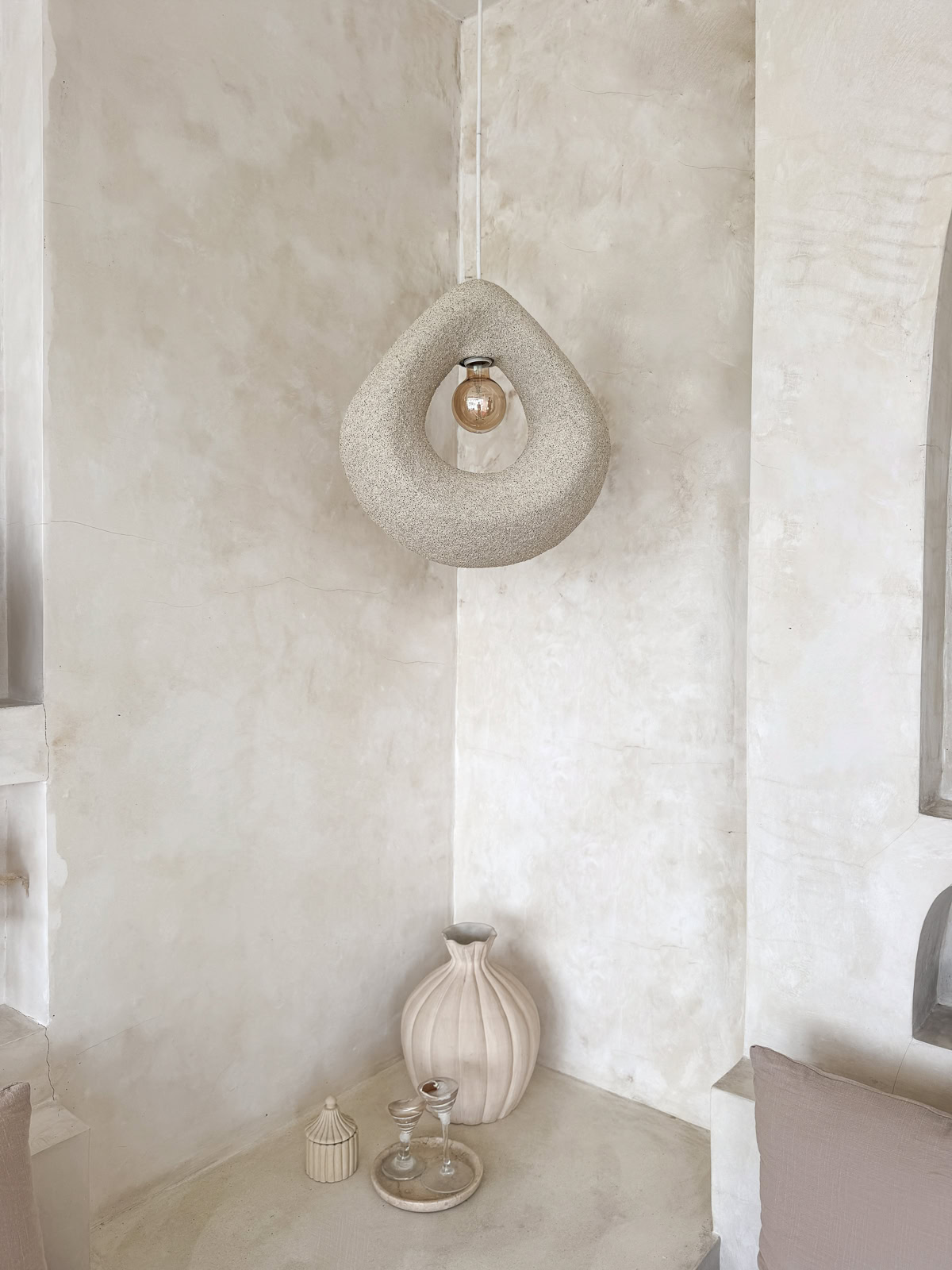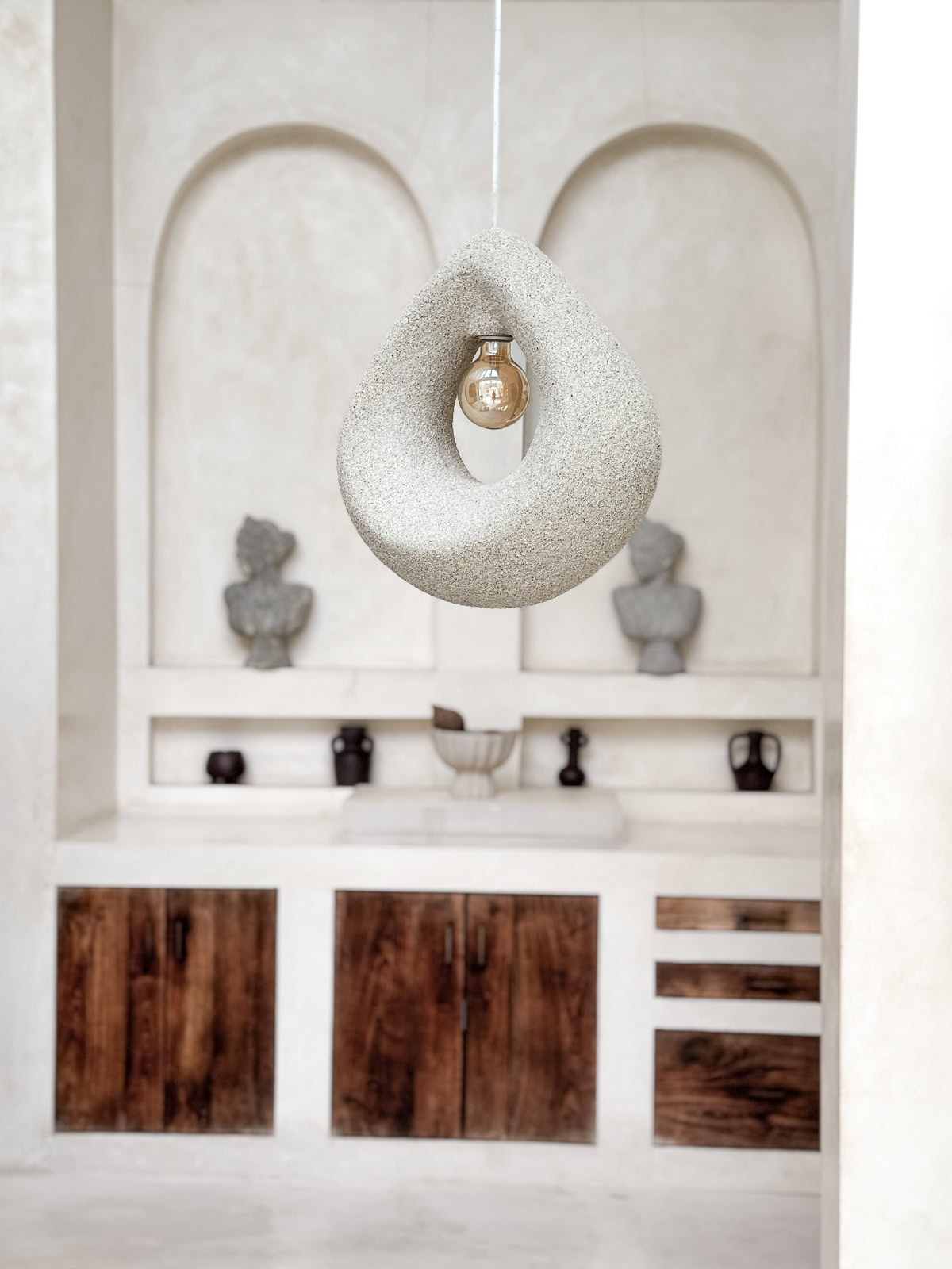 Opis: Ręcznie tworzona na Bali beżowa lampa o organicznej, rzeźbiarskiej formie, idealna do wnętrz japandi, wabi sabi, skandynawskich i scandi boho