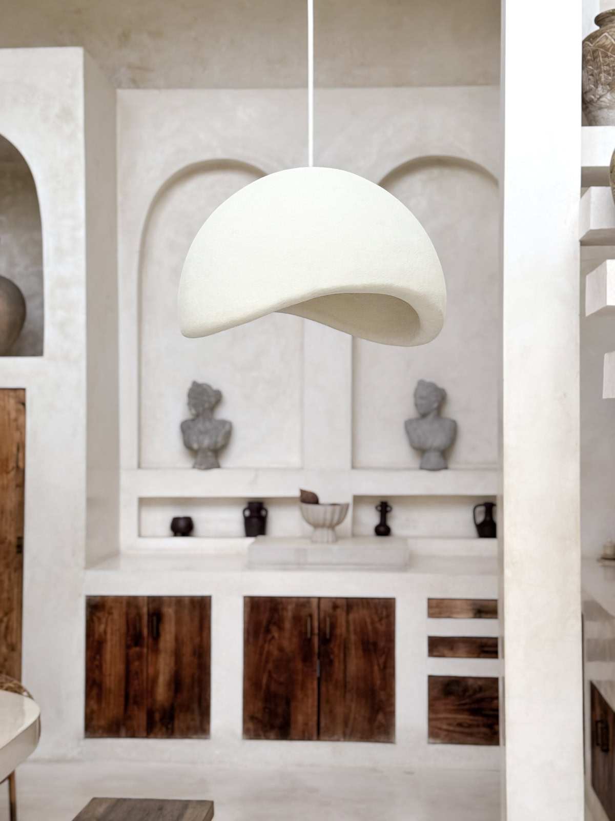 To również model bliski estetyce lampa wabi sabi, ponieważ jego siła nie polega na idealnej gładkości, ale na strukturze, naturalności i spokojnym pięknie. Można patrzeć na niego także jak na lampa designerska, która świetnie odnajduje się tam, gdzie pojawiają się nowoczesne lampy sufitowe, ale nadal liczy się materiał, ręczne wykonanie i ponadczasowy charakter. W większym rozmiarze doskonale prezentuje się nad stołem, w salonie albo w otwartej przestrzeni dziennej.