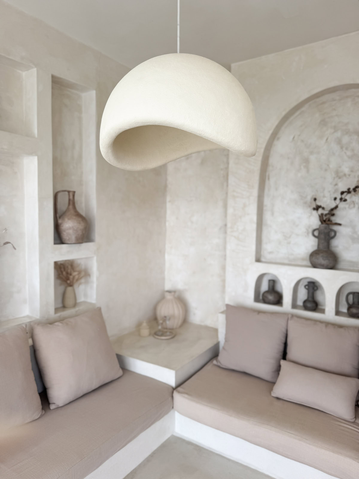 Jako lampa japandi ten model bardzo dobrze odnajduje się w przestrzeniach opartych na prostocie, świetle i naturalnych wykończeniach. Pięknie współgra z tym, czym wyróżnia się styl skandynawski, czyli spokojem, funkcjonalnością i jasną, uporządkowaną estetyką. Dobrze wpisuje się także w klimat scandi boho, gdzie ważne są organiczne formy, miękkie faktury i rzeczy, które nie wyglądają zbyt perfekcyjnie. Jako oświetlenie japandi daje efekt subtelny, ale bardzo wyczuwalny w całym wnętrzu.