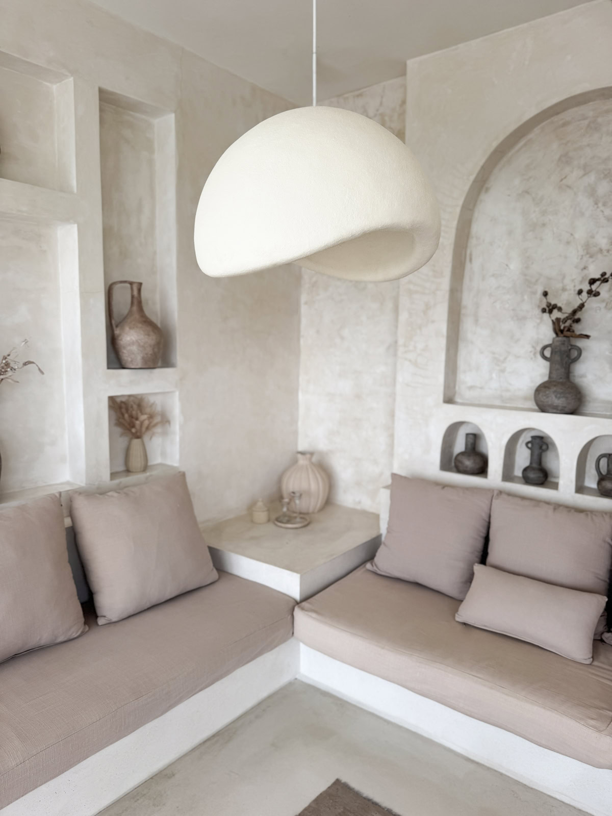 Model powstaje ręcznie na Bali u rzemieślników, których znamy osobiście. Dla nas to ważne, bo za każdą lampą stoi konkretna praca, doświadczenie i człowiek, a nie anonimowa produkcja. W Lampie STONE CREAM L widać uważność wykonania i taki rodzaj autentyczności, który trudno podrobić. To przedmiot, który wnosi do wnętrza nie tylko światło, ale też historię, materiał i ręczny ślad twórcy.