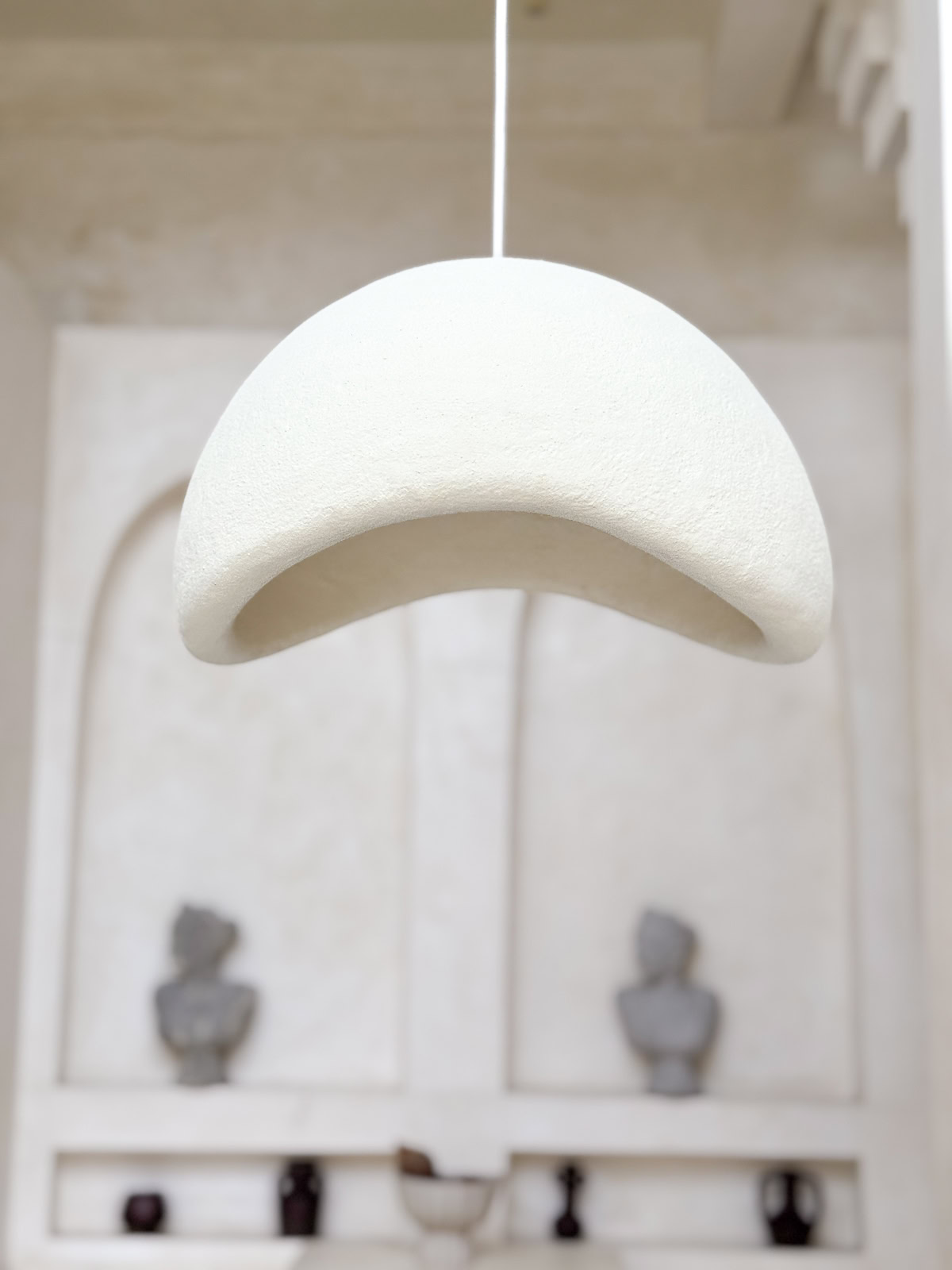 Opis: Ręcznie tworzona na Bali lampa o organicznej fakturze, wykończona prawdziwym piaskiem, idealna do wnętrz japandi, wabi sabi i scandi boho