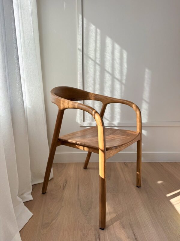 To drewniane krzesło które idealnie wpisuje się w aranżacje inspirowane naturą, stylem japandi, skandynawskim czy rustykalnym. Dzięki odporności drewna teakowego, mebel może być także używany w zadaszonych przestrzeniach zewnętrznych.