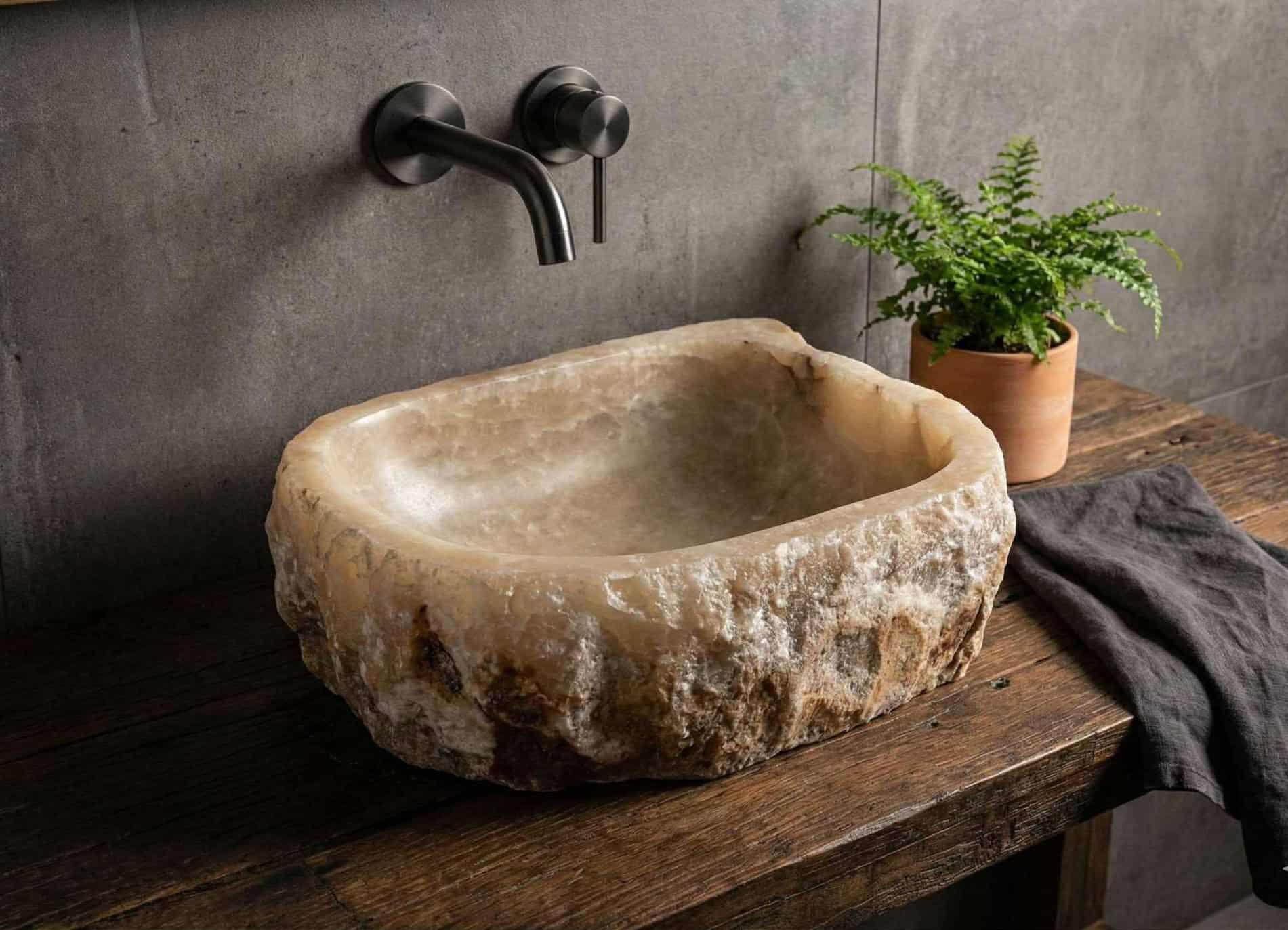 Każda z umywalek nablatowych została wykuta ręcznie na Bali.