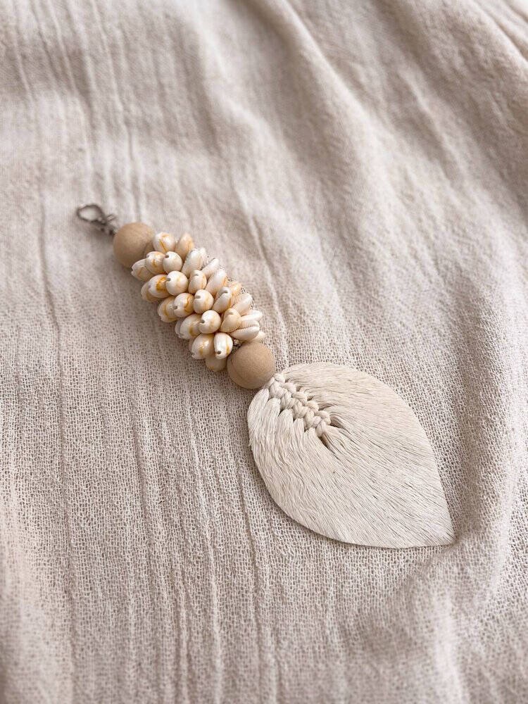 Ten wyjątkowy brelok w kształcie liścia został w całości wykonany ręcznie na Bali przez lokalnych rzemieślników. Użyto do niego starannie dobranych muszli naturalnych, które różnią się nieco kształtem i fakturą od klasycznych modeli — właśnie dzięki temu każda boho zawieszka jest absolutnie unikatowa. To nie tylko brelok do kluczy, ale też stylowa ozdoba do plecaka lub torebki, inspirowana wyspiarską estetyką i pełna rękodzielniczego uroku. Sprawdzi się idealnie jako drobny prezent lub pamiątka z nutą egzotyki. Dodaj swojej codzienności odrobinę stylu boho i autentycznego klimatu Bali.