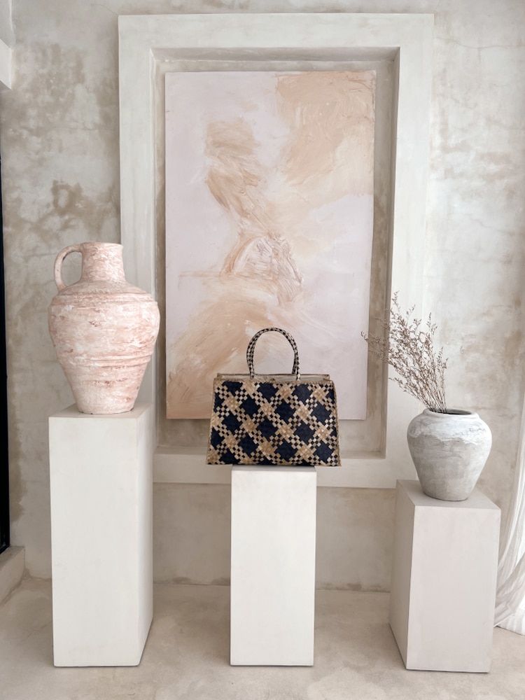 Klasyczna torebka shopperka w kratkę to efekt pracy utalentowanego balijskiego rzemieślnika. Wykonana z solidnych liści palmowych splecionych w unikalny sposób, tworzący efekt kratki. Ta torebka shopper to ponadczasowy dodatek, który pasuje do codziennych stylizacji ale zagra również dobrze z eleganckim lookiem. Ta torebka shopperka została wypleciona z dużą precyzją w 100% ręcznie w małej, lokalnej firmie.