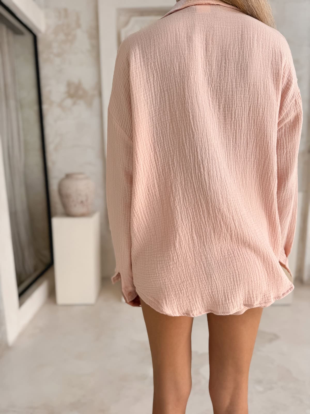 Ten komplet muślinowy damski w brzoskwiniowym odcieniu to propozycja na lato dla osób, które lubią delikatny kolor i wygodny krój. Całość prezentuje się lekko, świeżo i bardzo naturalnie, dlatego dobrze sprawdzi się zarówno na co dzień, jak i podczas wyjazdów.