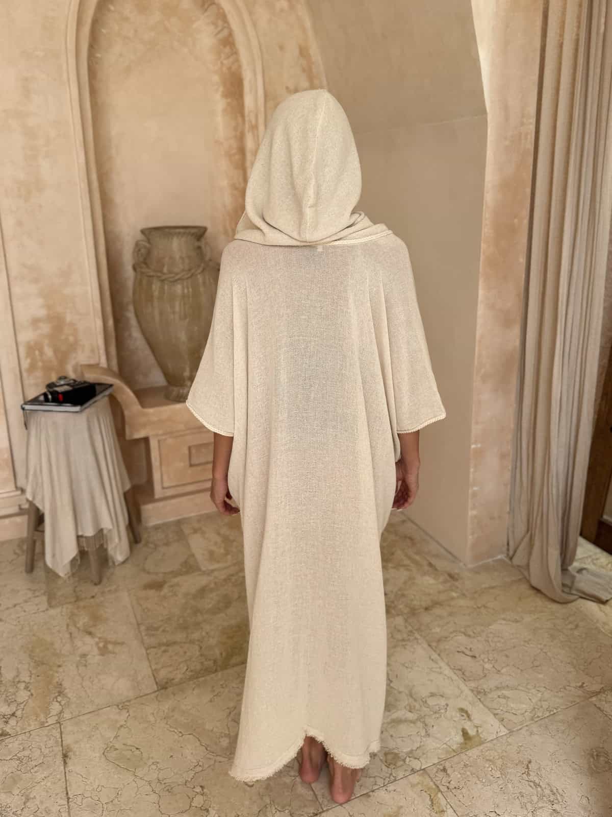 Długa narzutka boho z kapturem w kolorze kremowym to połączenie wygody, naturalnego stylu i swobodnej elegancji. Wykonana w 100% z roślinnego włókna konopnego, jest lekka, przewiewna i przyjemna w noszeniu nawet w cieplejsze dni. To model stworzony z myślą o kobietach, które cenią autentyczność, naturalne materiały i ubrania z charakterem.
