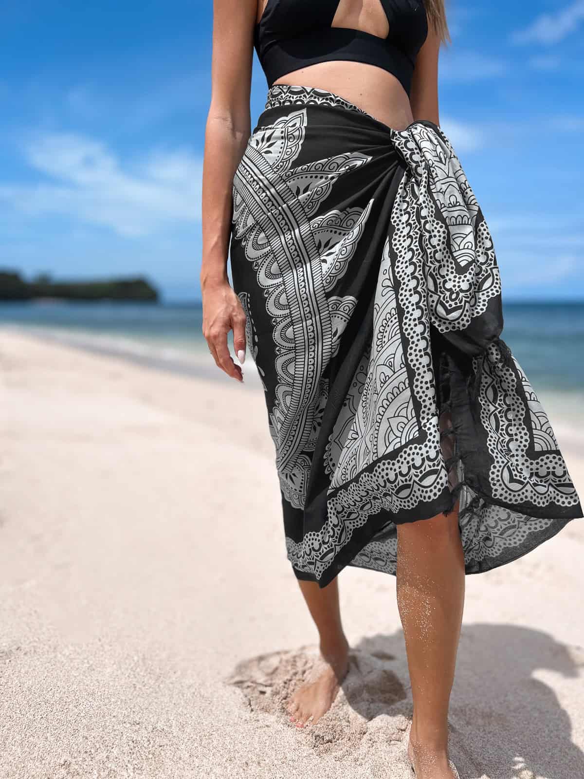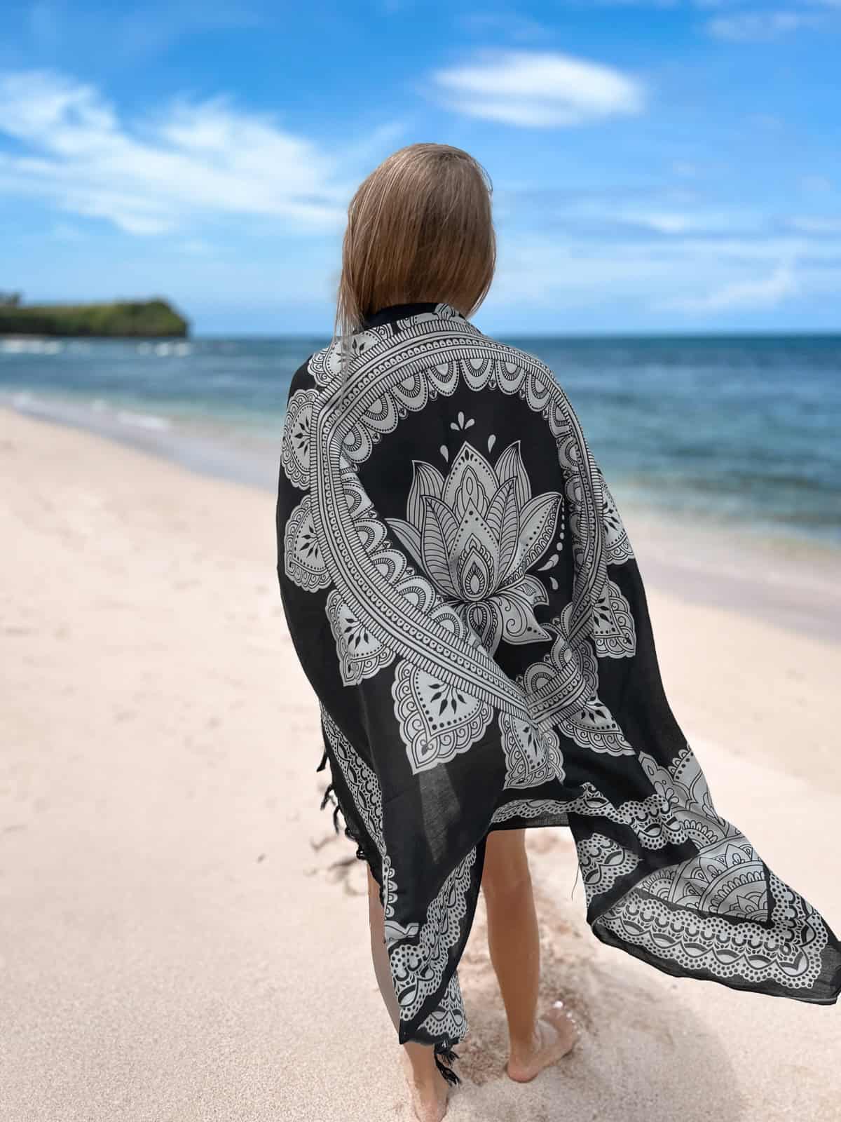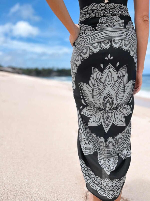 Opis: Stylowa chusta plażowa w kolorze czarnym z wzorem lotosu, wielofunkcyjna